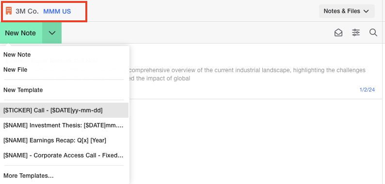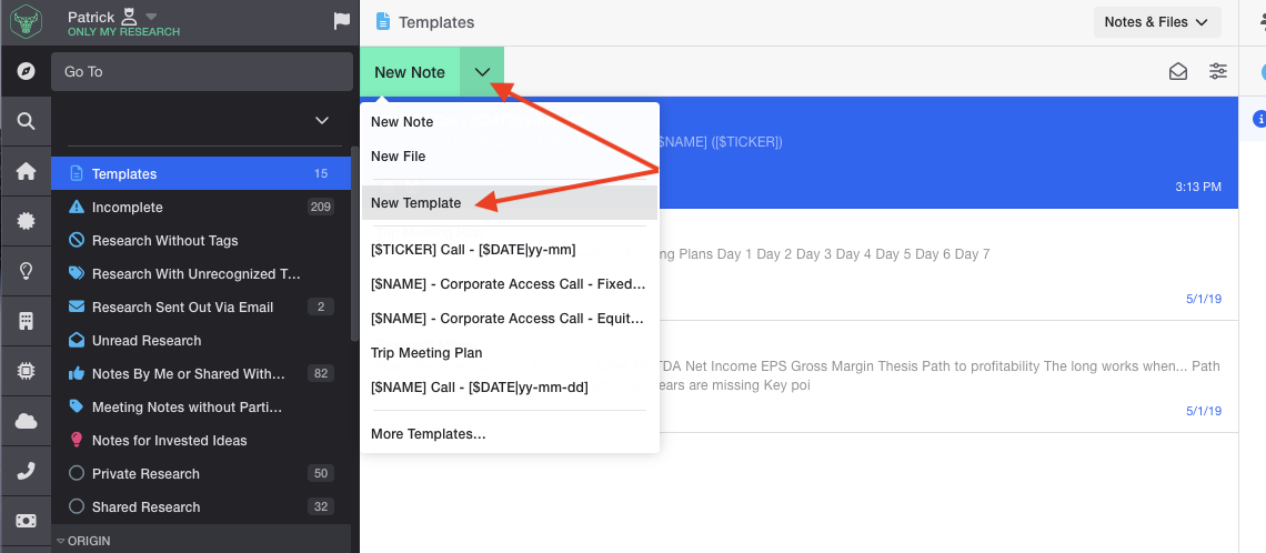 To create a template with dynamic placeholders, use the green arrow dropdown in the middle note pane: