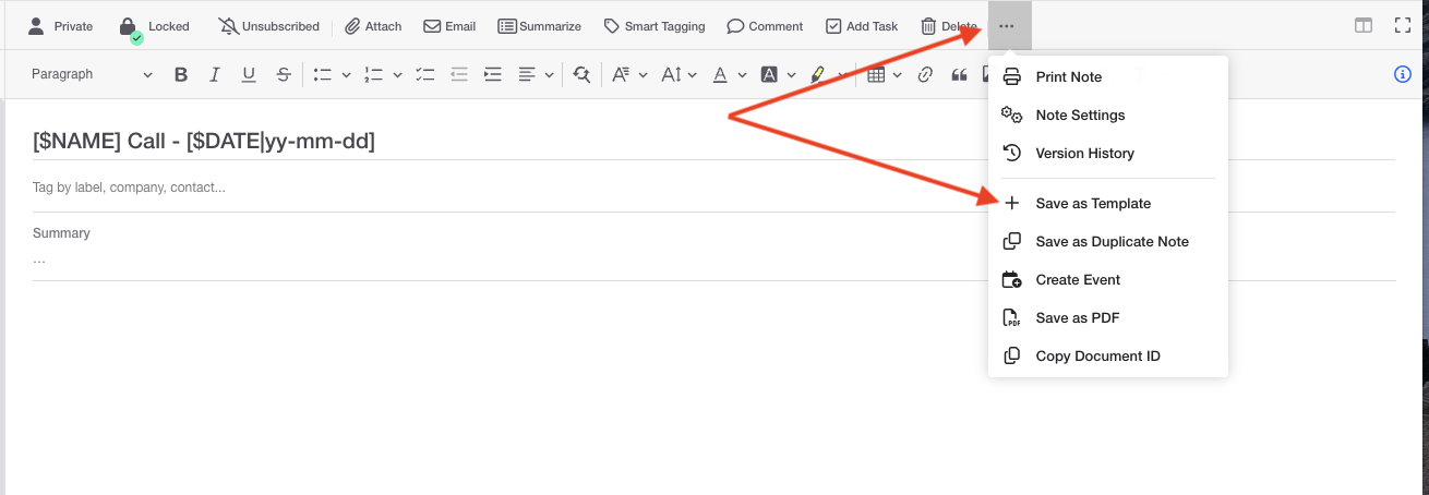 Or, if you're in an existing note, select the dot icon at the top of the note toolbar and select"Save as template".