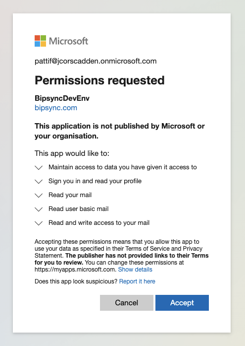 Sign in to the account whose mailbox you wish to link with Bipsync and agree to the requested permissions.