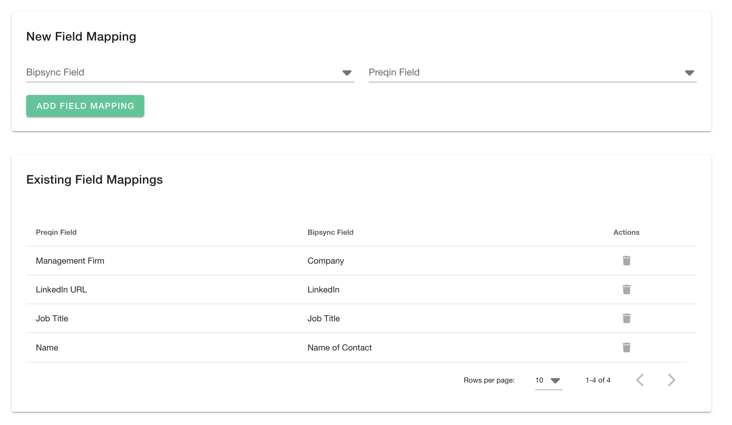 To delete a field mapping simply select the trash can icon next to the mapping.