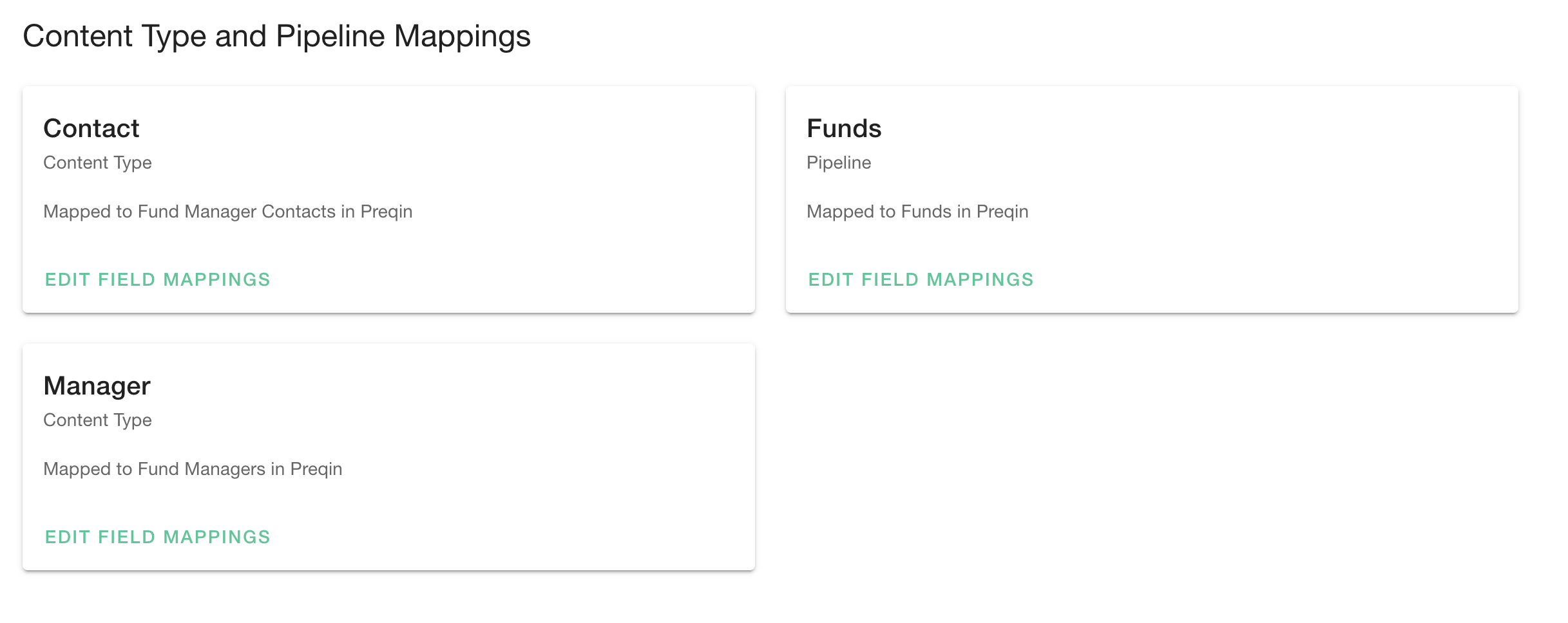 - Navigate to Integrations, Preqin, Field Mapping. You will be shown a list of available content types and pipelines for mapping: