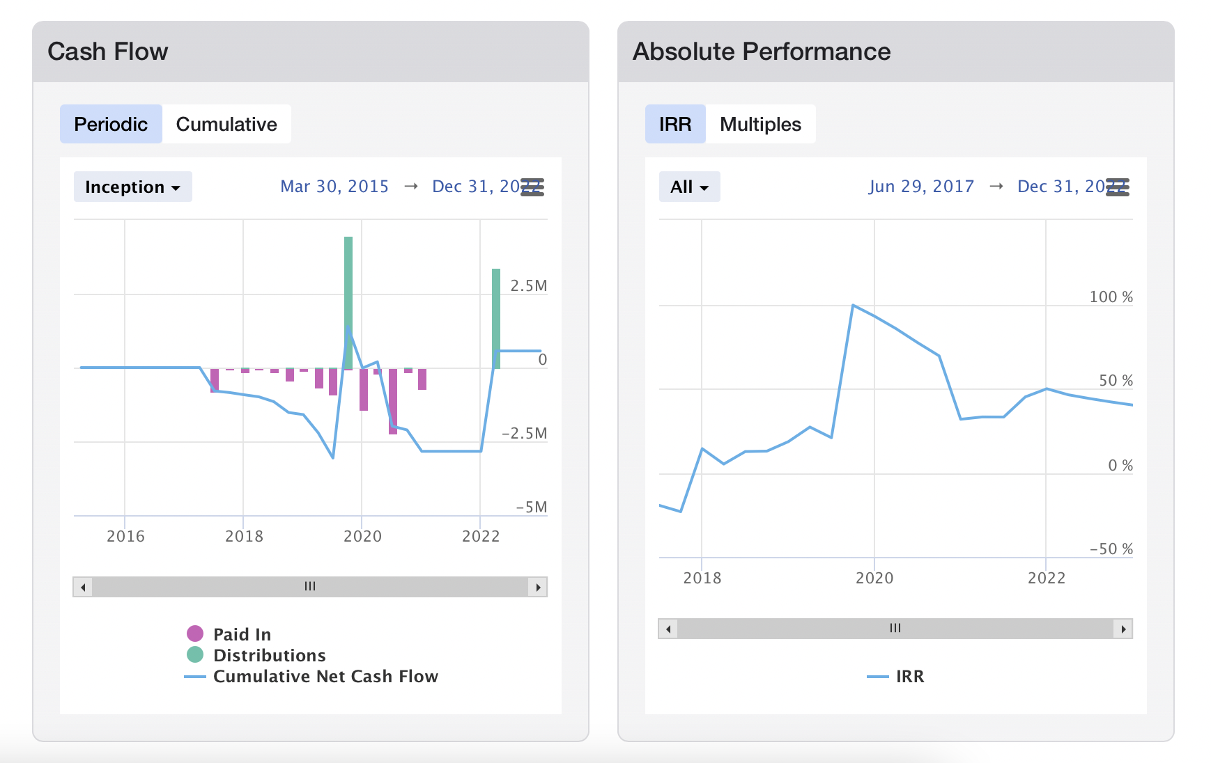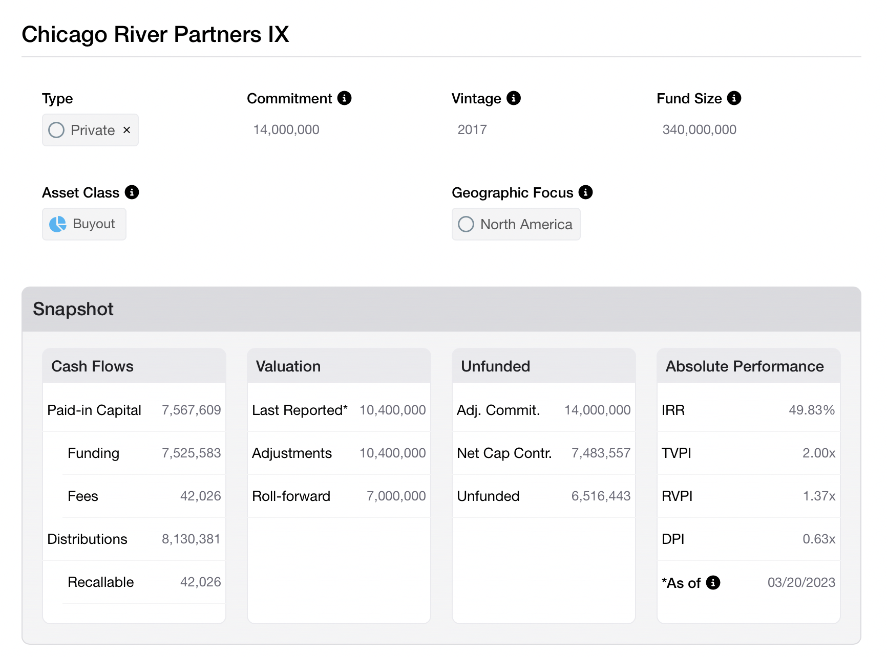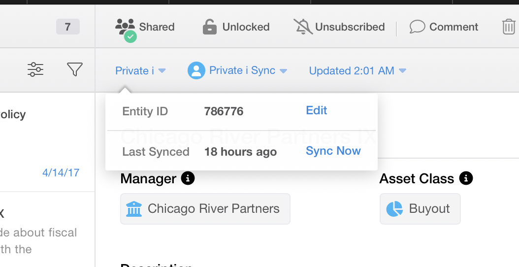 Mapped entities are able to display Private i data within their fields. In the screenshot below, fields like "Paid In Capital", "Distributions" and "IRR" are all sourced from Private i: