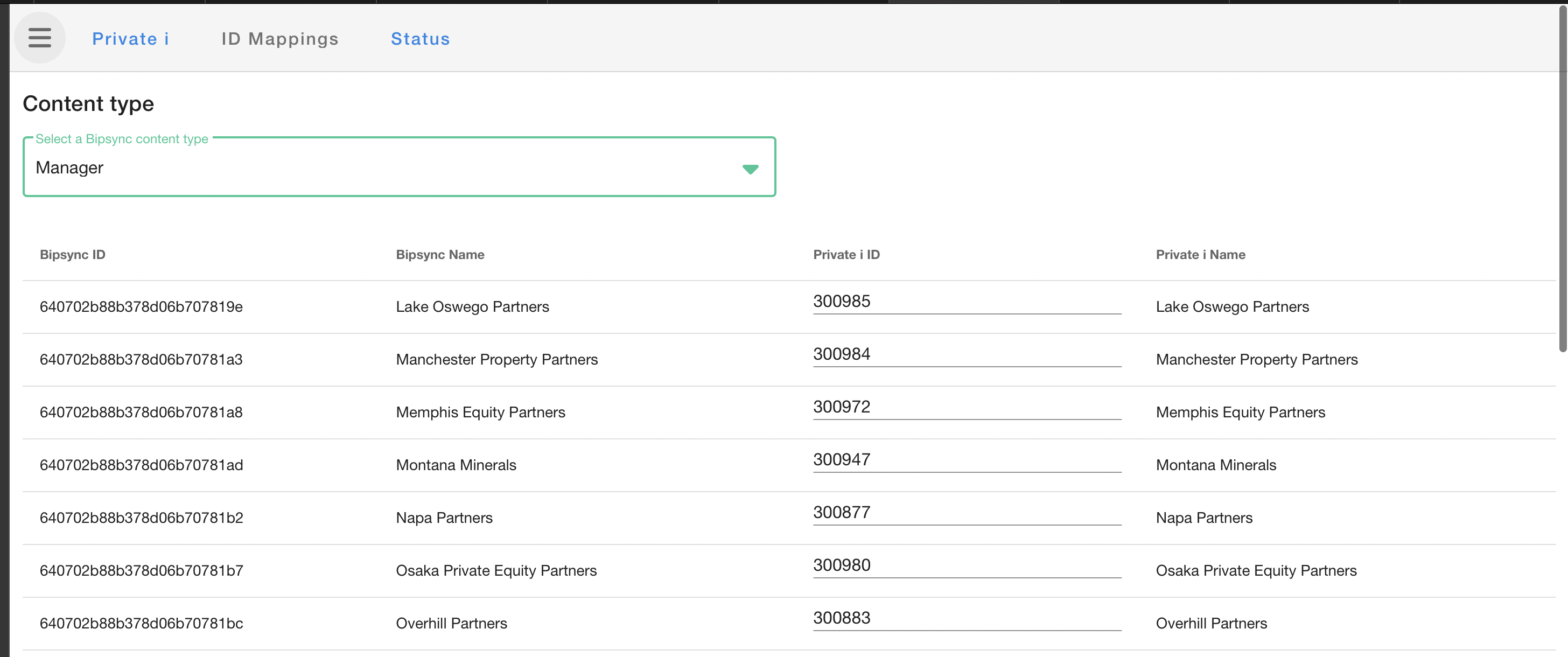 Choose the content type you wish to manage (we've chosen the Manager entity above, which contains Fund Managers in this example) and you'll see a list of the entities which exist in Bipsync. You can then enter the IDs for the matching entities in Private i, and click the Save button to apply your changes.