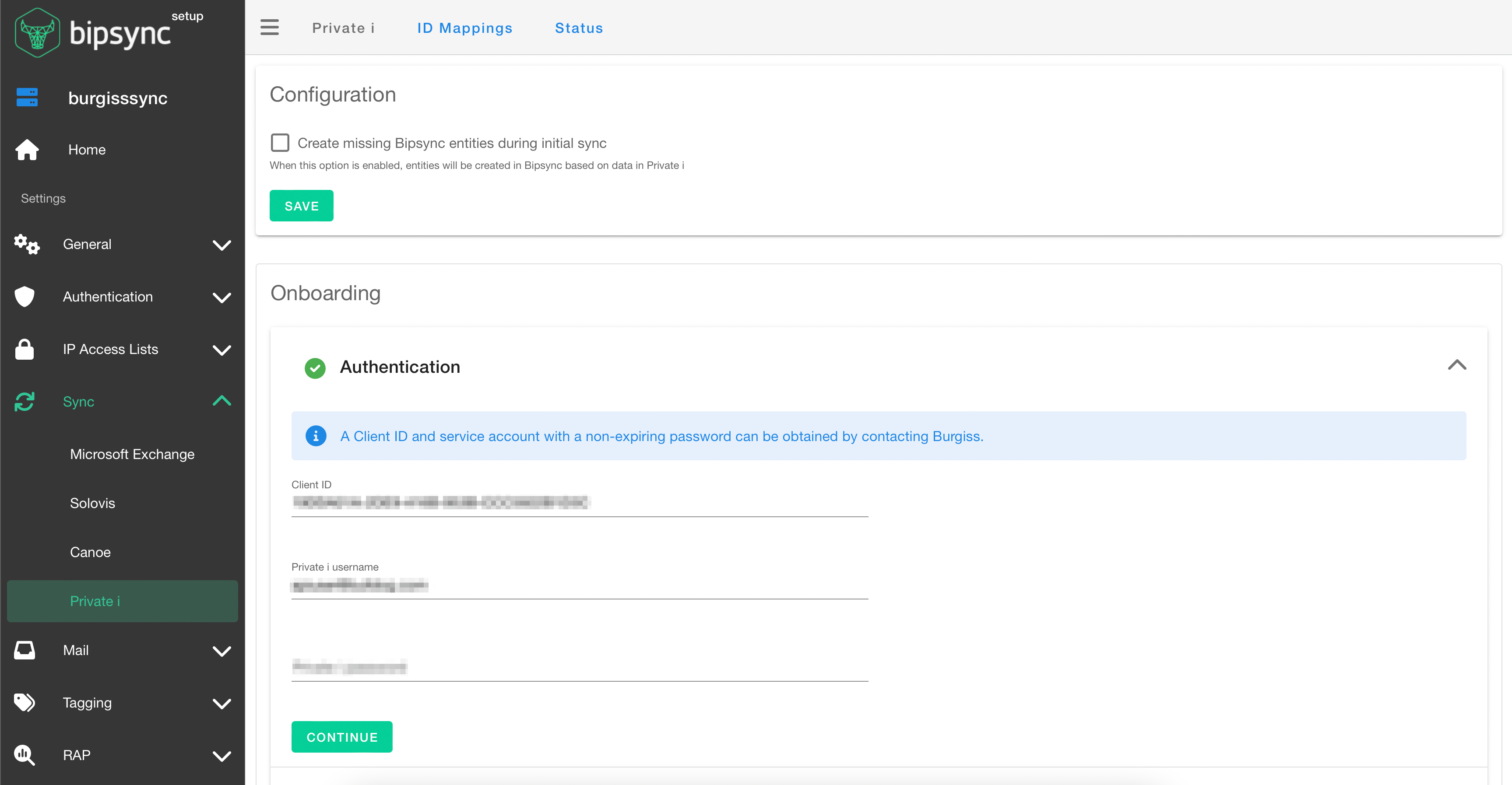 Configuration is performed in the Bipsync Setup app. From the menu, go to Integrations → Private i. You'll see the following screen: