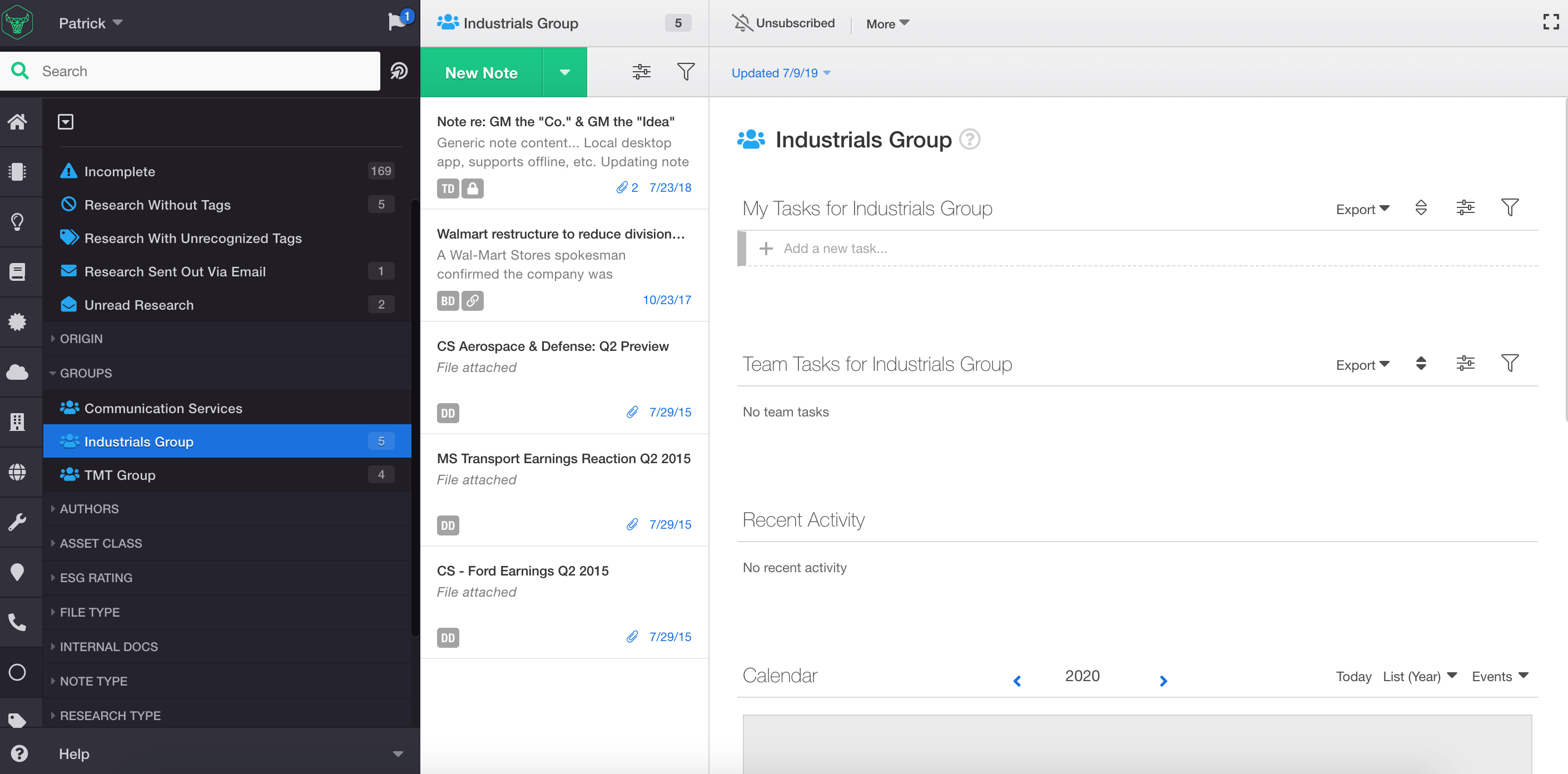 1.) First, click on the record of an item in the left hand nav panel, or select a note from the middle pane. In this example we've selected the 'Industrials usergroup' so we can get notified of new notes or files that have been published by members of this group.