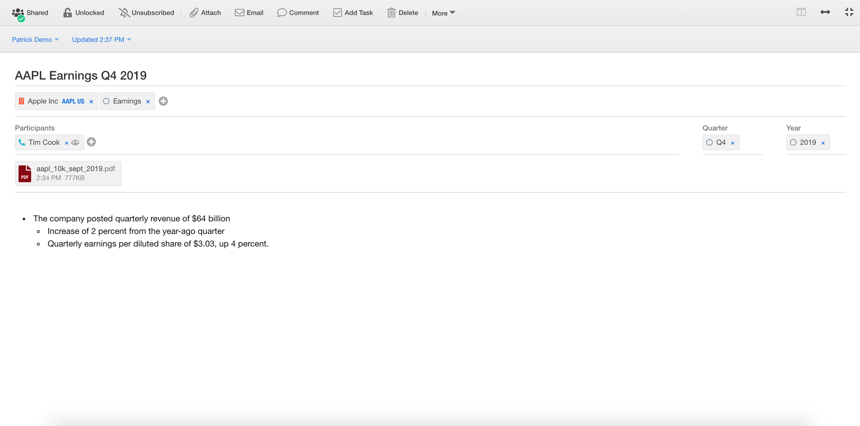 5.) To create a PDF of every note associated with a single tag, simply go to your chosen tag - company AAPL for example - and click the More option to 'Export Research to PDF'. Every note associated with that tag is automatically converted into a single PDF ready for print.