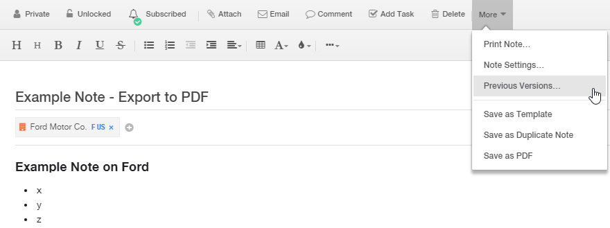 On the left-hand side of the Version History, all previous versions of the note will appear. Select the desired version and click Revert to Selected Version.