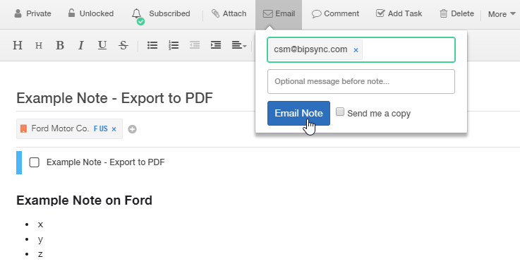 You can email notes out of Bipsync by clicking the Email button at the top of the note. Type in the email address you’d like to send the note to, then click Email Note.